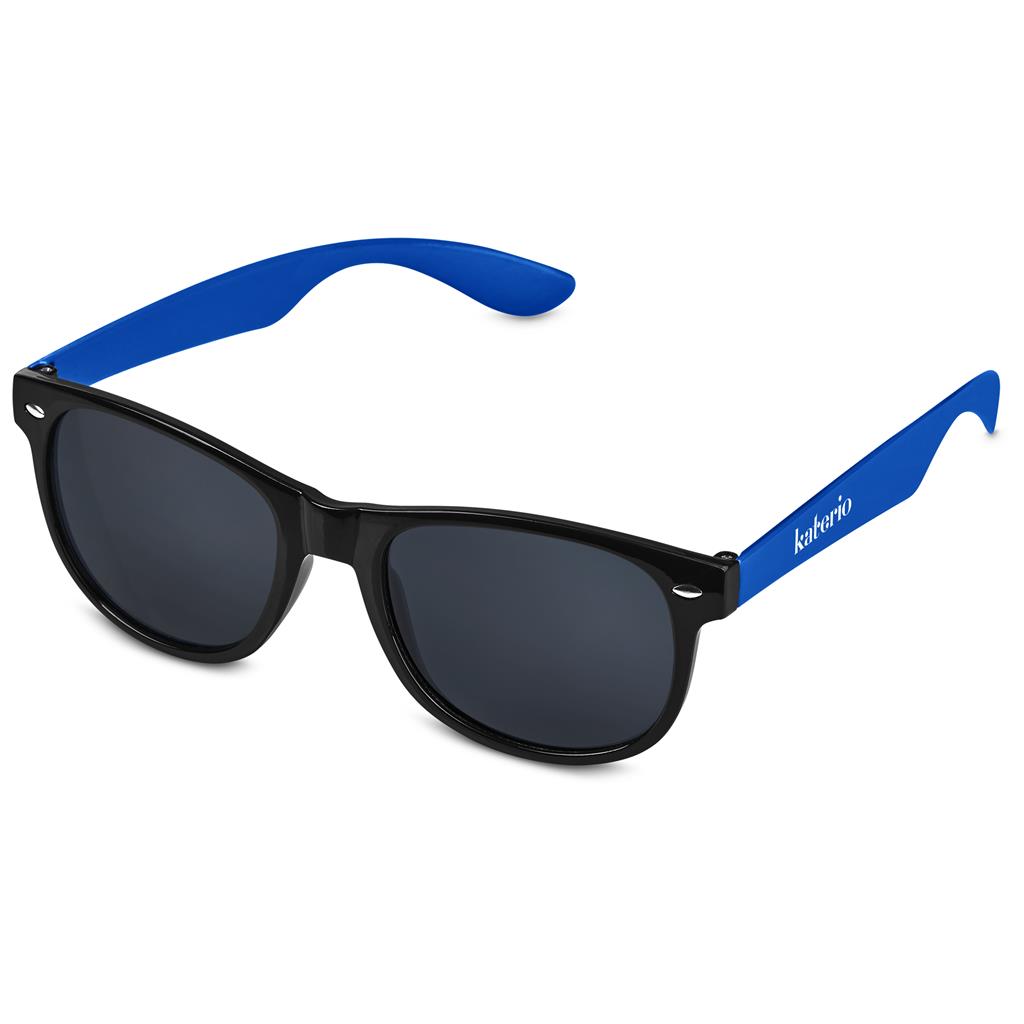Classic sunglasses design with a black frame and colour temples. The combination helps to promote your brand while toning down the overall look, making the sunglasses more likely to be frequently used.