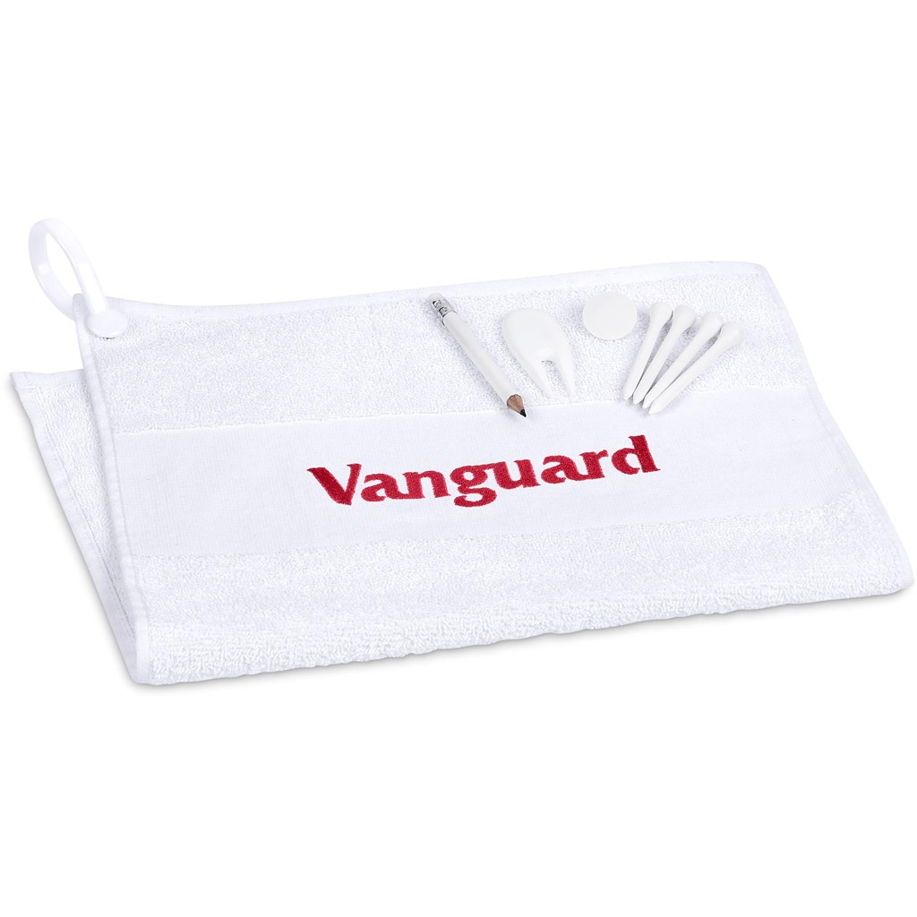 This neatly packaged golf set is a great gift for golf days. It includes a 400g/m2 cotton golf towel, mini pencil with eraser, divot tool, ball marker and four golf tees.