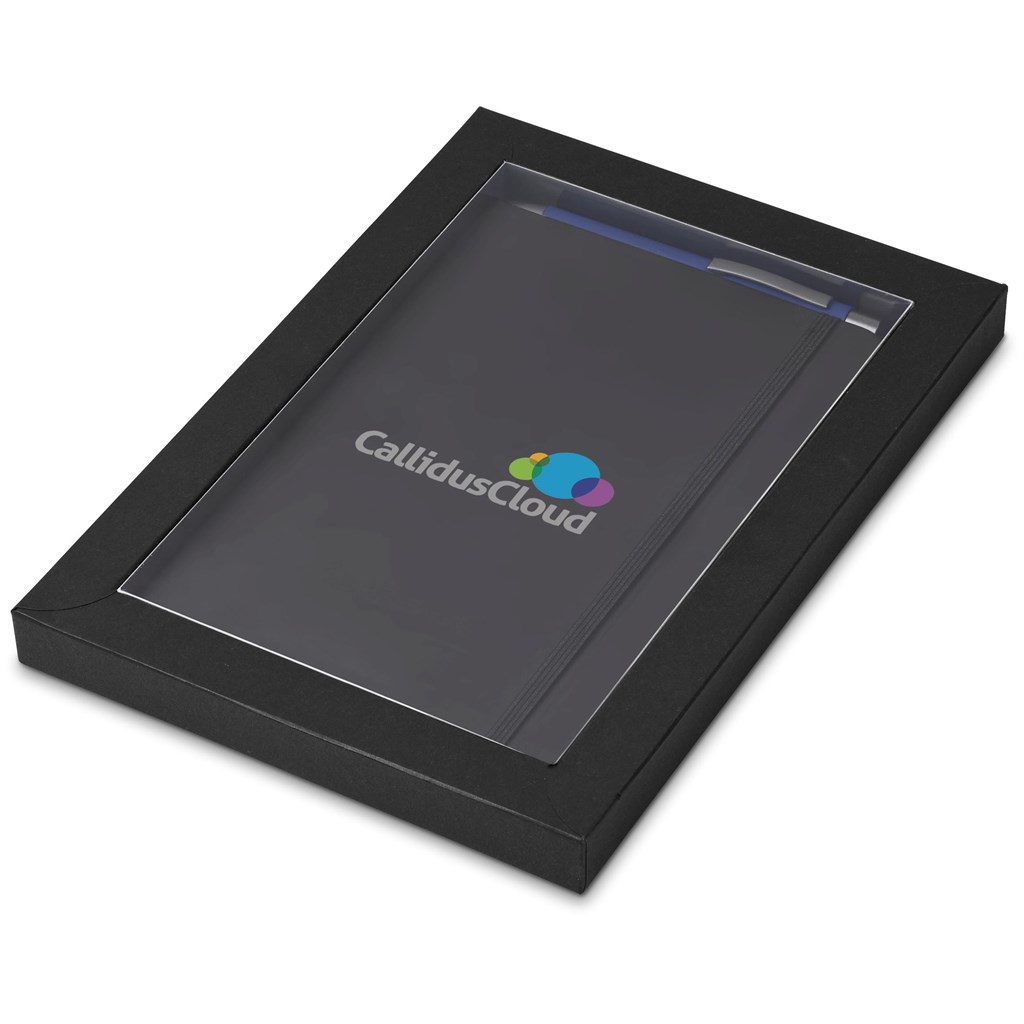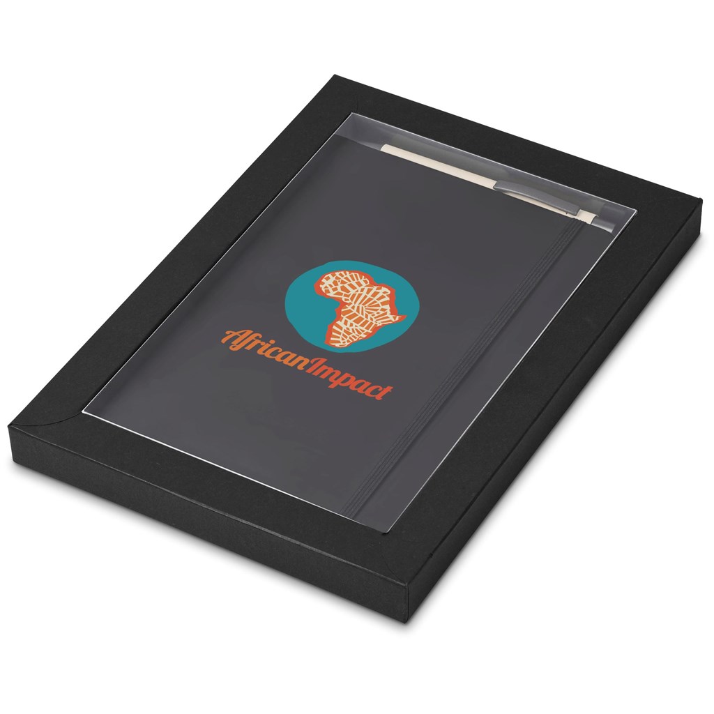 A black Omega A5 Hard Cover Notebook and an Omega Ball Pen in your choice of colour are packaged together in a box which provides bright and clear exposure for your branding. The box has a firm cardboard base, and a transparent acetate lid.