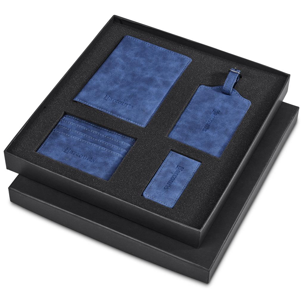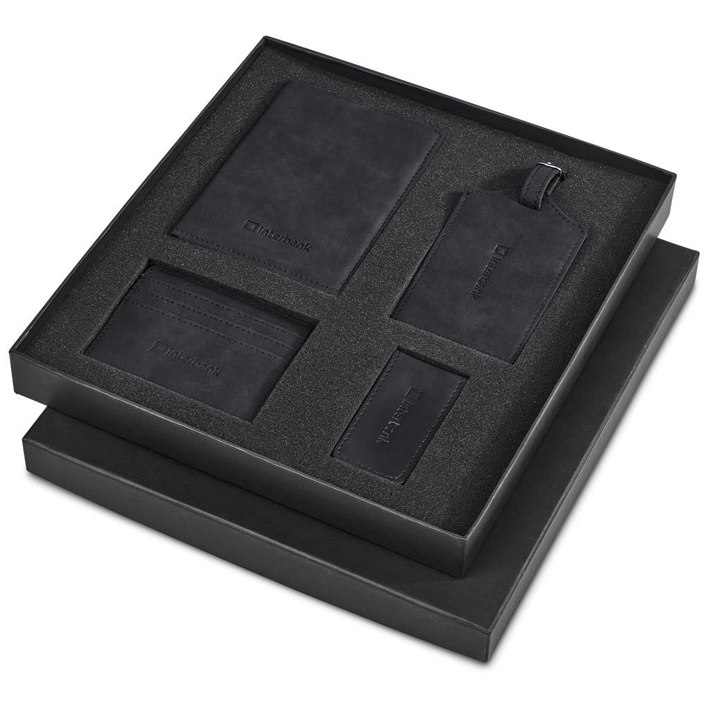 This travel set includes a passport holder, luggage tag, card holder, and money clip, elegantly presented together in a black two-piece gift box. Each item is securely held in place by a custom sponge tray, ensuring a stylish and organised presentation. The 4 items are designed for debossing branding with the same logo of the same size on each item, to save on producing multiple dies.