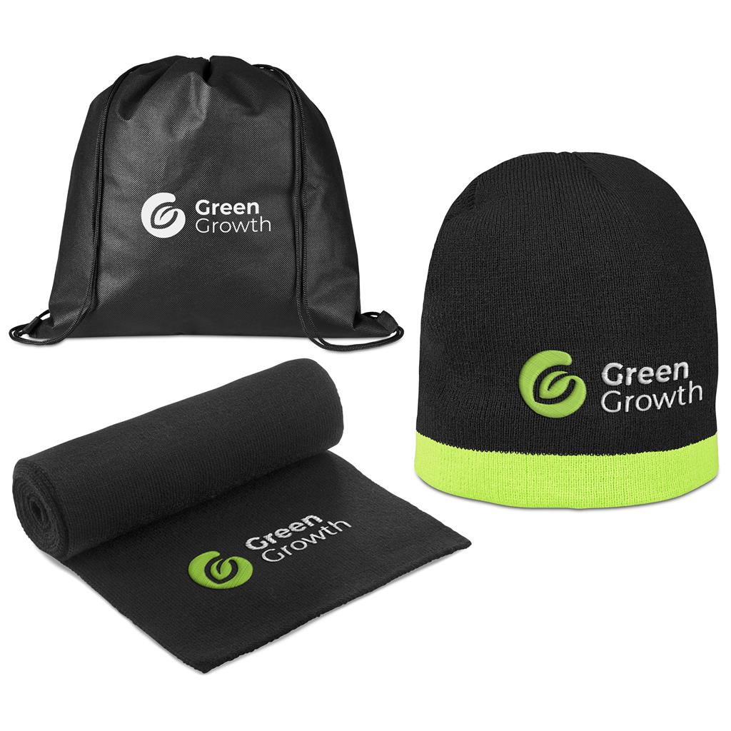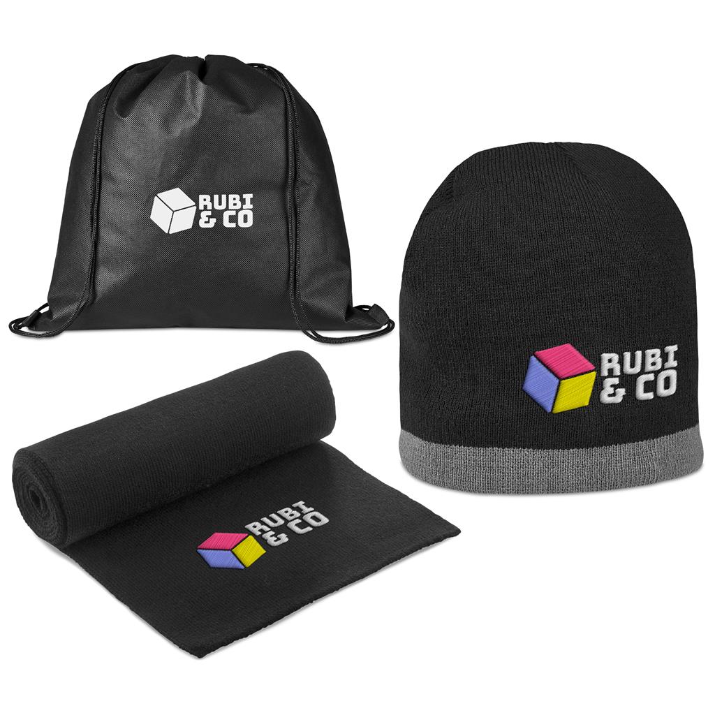 Stay warm this Winter, or in the outdoors, with this cosy scarf and beanie, packaged together in a drawstring bag.