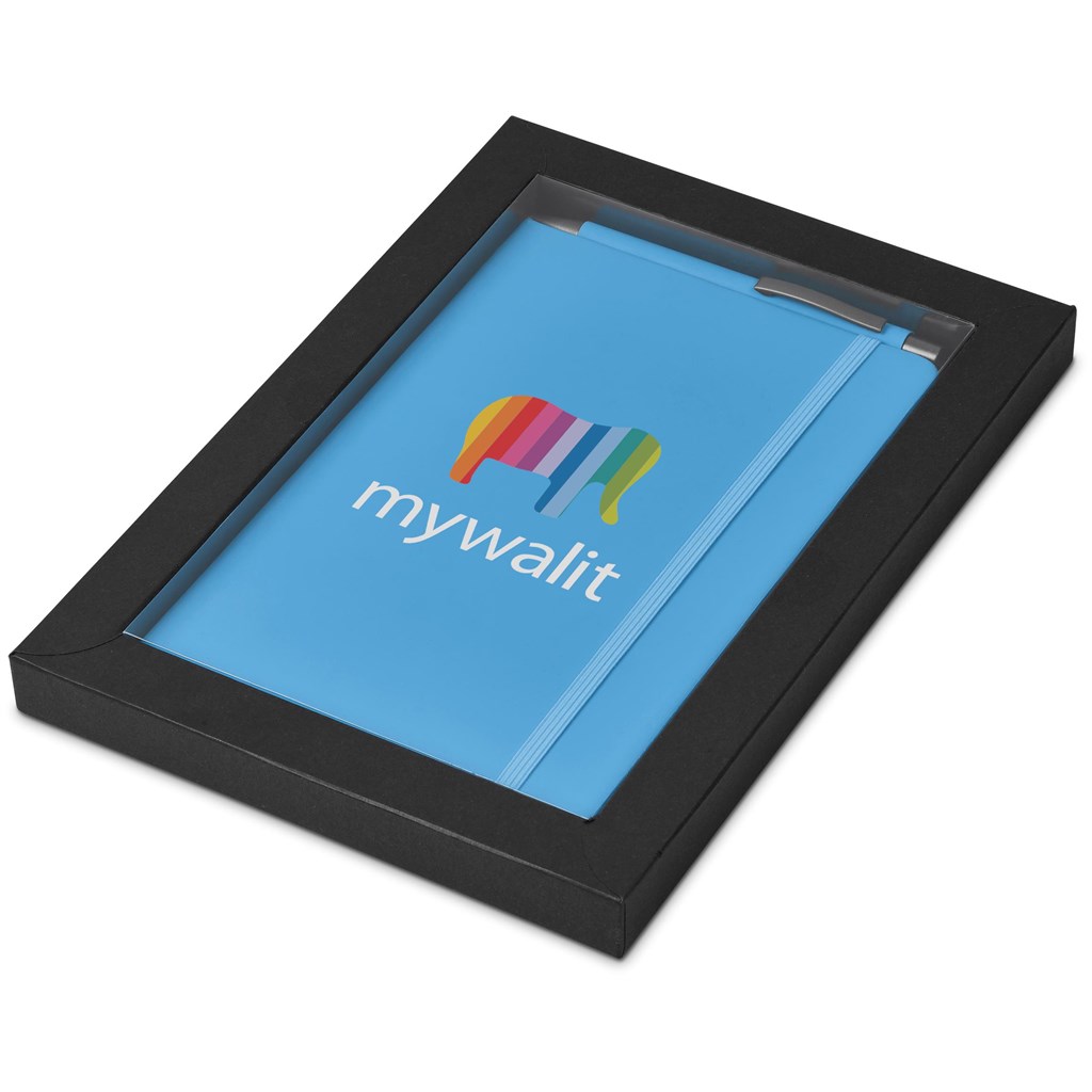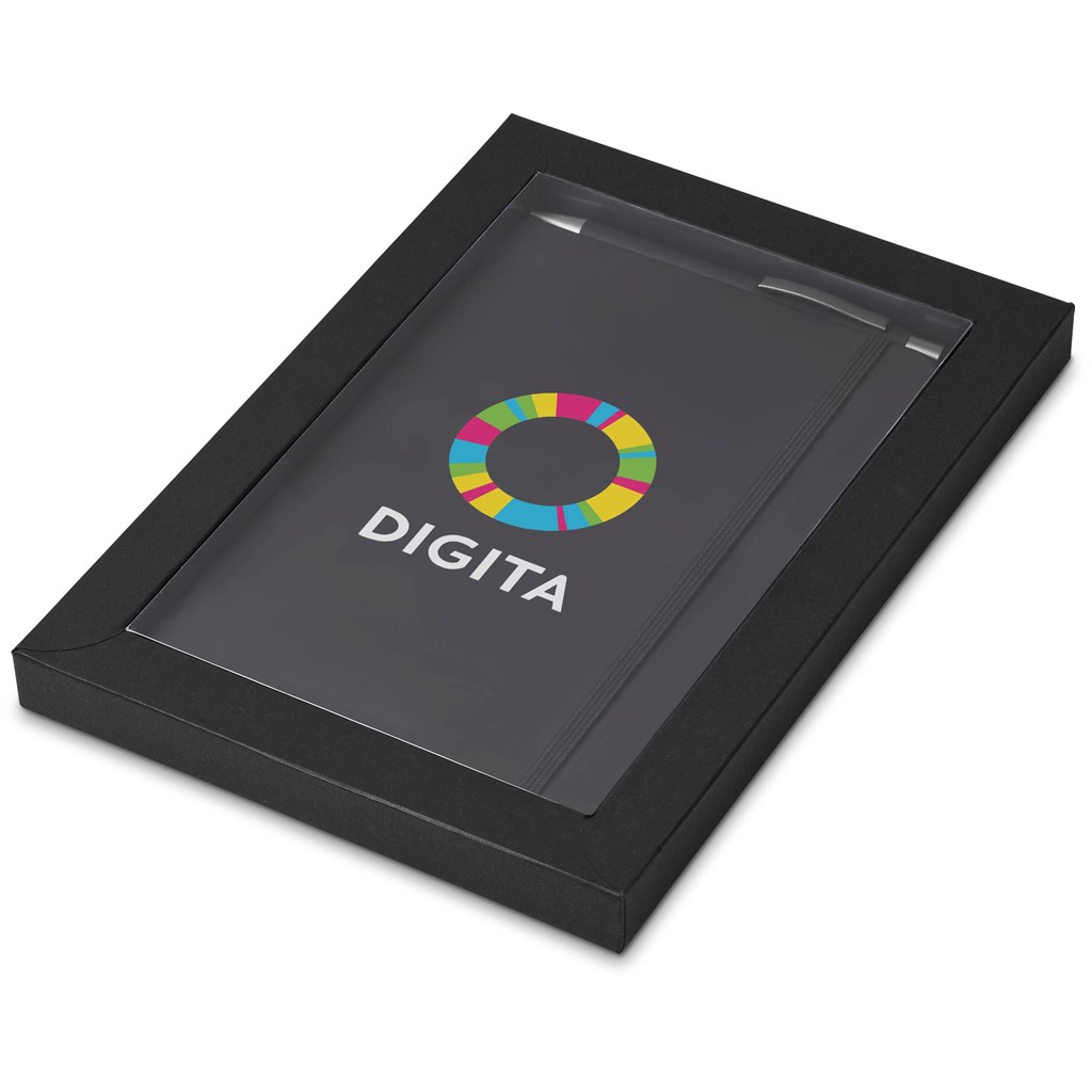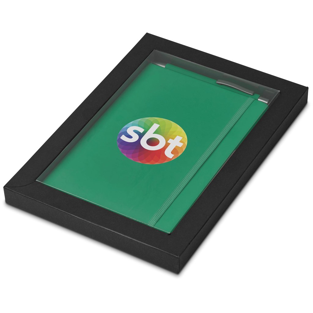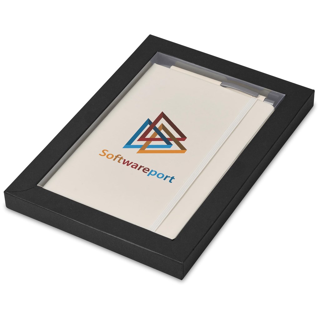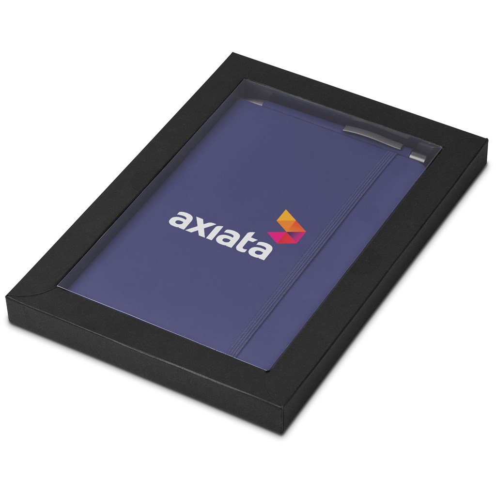 A matching Omega A5 Hard Cover Notebook and Ball Pen are packaged together in a box which provides bright and clear exposure for your branding. The box has a firm cardboard base, and a transparent acetate lid.