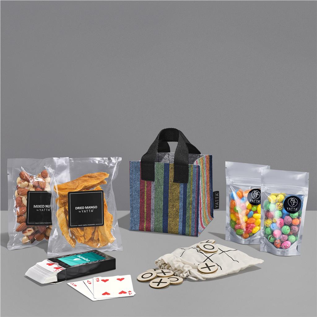 The Yatta range of hampers is expertly crafted to provide a delightful experience with a curated selection of premium items and edible treats. The contents are elegantly presented in a Yatta sublimated RPET felt mini gift bag.